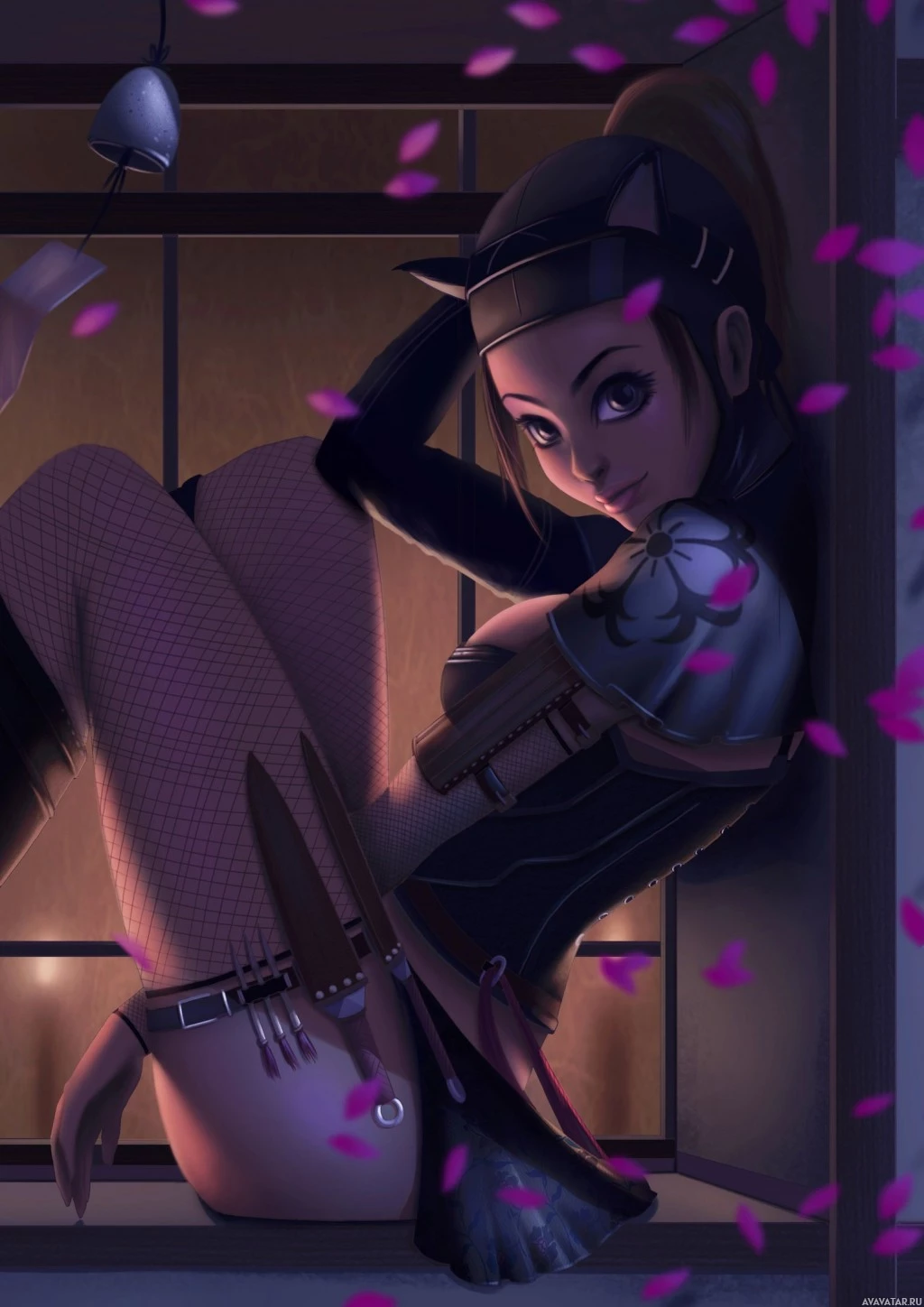 a dynamic pose, as if she has just finished a battle or is preparing for one. Her attire consists of