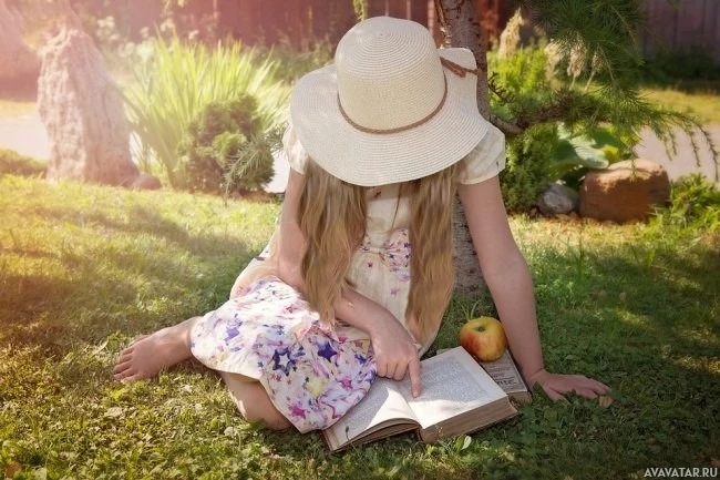 The image features a child sitting on the grass outside. The child is wearing a hat and appears to be reading a book, as indicated by the visible pages. There's also an apple near the child, suggesting that they might be having a snack while reading. The setting looks like a peaceful garden or park, with trees and some sunlight filtering through the foliage, creating