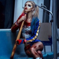 Harley Quinn from the comic book series. The individual has striking makeup and costume elements that are associated with this character, such as the red and blue suit with white stripes down the sides, black tights with fishnet stockings underneath, knee-high boots, and