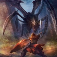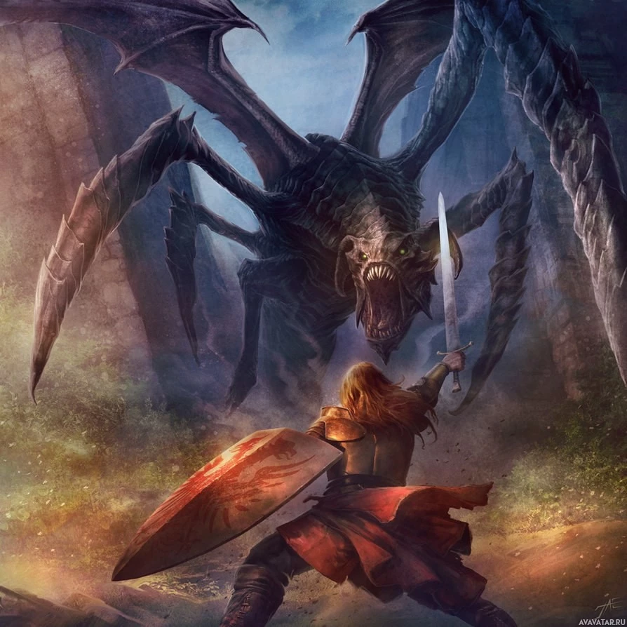 a female warrior is facing down a large, menacing monster. The warrior is armed with a sword and wearing armor that suggests she may be a knight or a similar