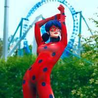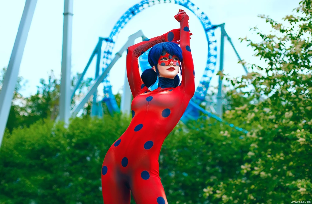The image shows a person in costume, who is dressed as Ladybug from the animated