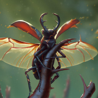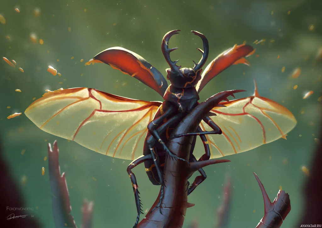 sharp eyes and mouthparts typical for beetles. There are subtle hints of other creatures near the bottom of the tree branch, suggesting