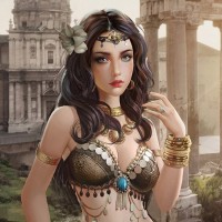 brunette girl," in what appears to be ancient or fantasy attire. She is wearing an outfit that suggests she could be from a historical or mythical setting, possibly representing a character from a bygone era or