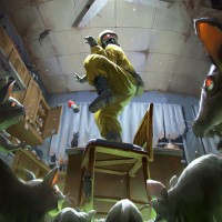protective gear, including a respirator mask, standing on what appears to be a chair or table in a room filled with rats. The character's posture suggests they are trying to fend off the rats that are all around them. There is an element of chaos and desperation conveyed by the scene.