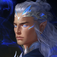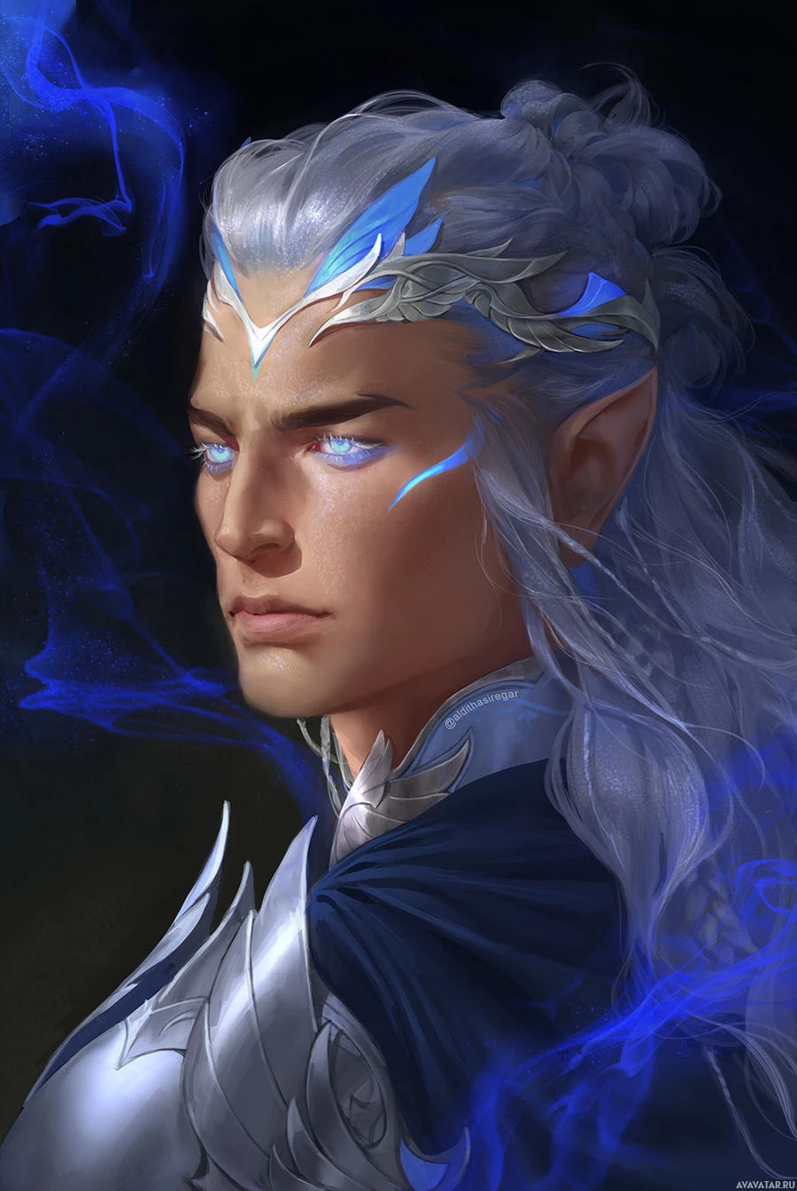 fantasy art. They have pointed ears, which is another typical characteristic of elves. Additionally, the character is adorned with what looks like a crown or headpiece that incorporates blue glowing elements, possibly indicating magical or mystical abilities. The overall appearance suggests that this is