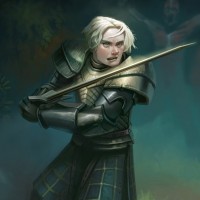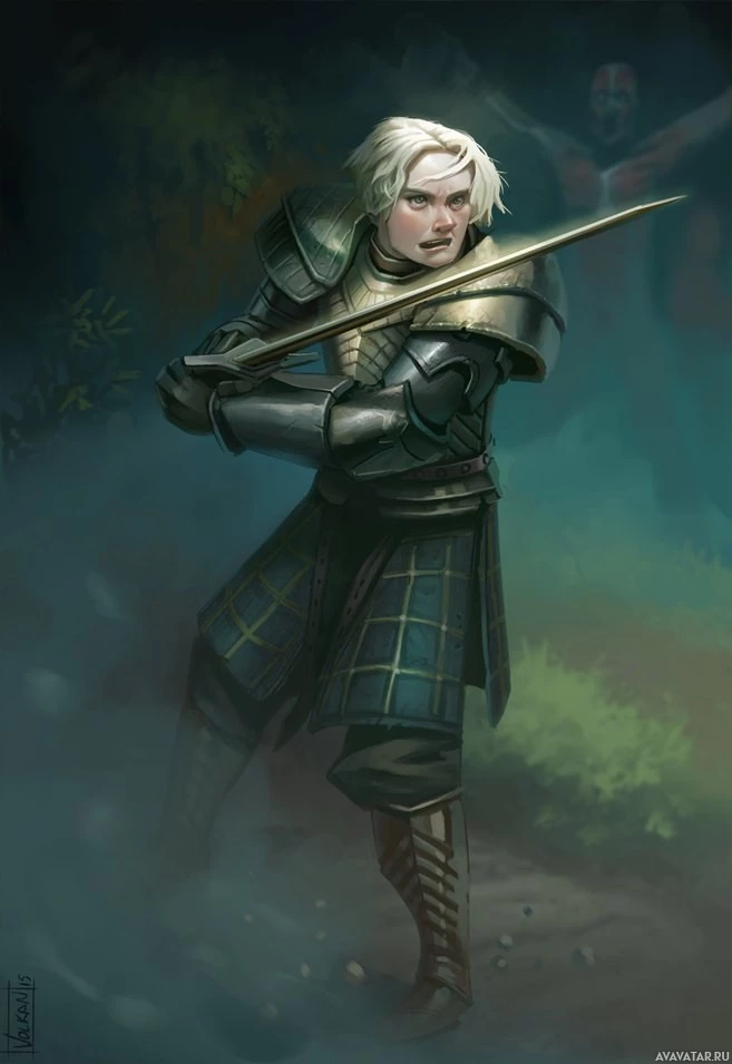 high fantasy settings. The character is wearing armor and holding a sword with both hands, suggesting they are ready for combat. They have short