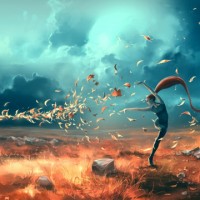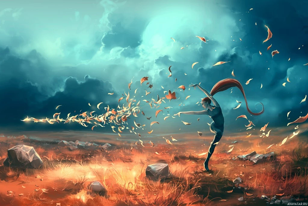 a sense of motion and energy, as if she is in the midst of a dance or casting spells due to the swirling leaves.