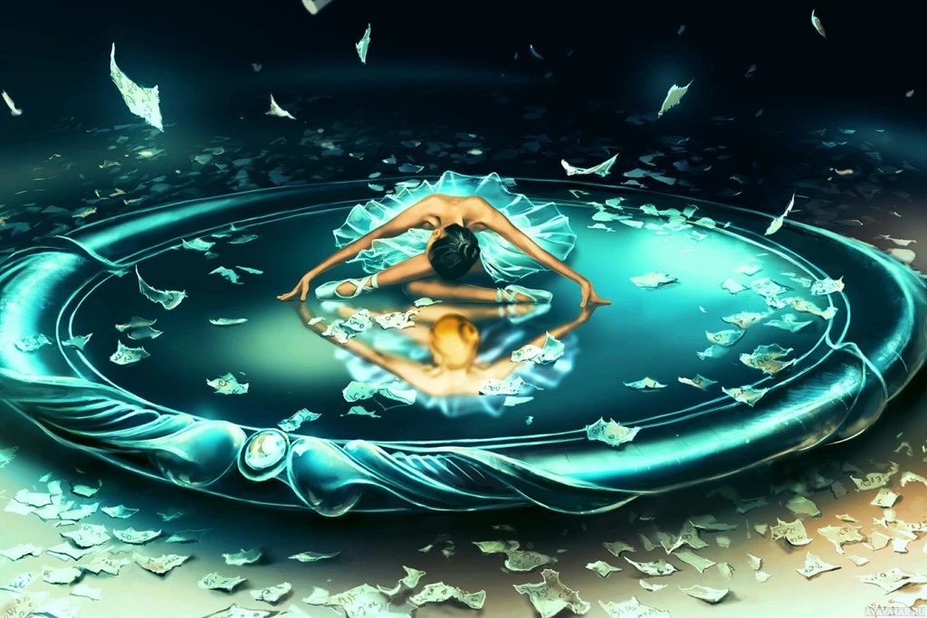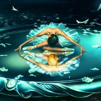 brown hair, appearing as a brunette, who is standing on a reflective surface that resembles water. She appears to be gazing down at herself or into the reflection below her. The surface she stands on is circular and seems to be floating in mid-air. It's adorned with what appears to be