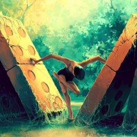 a young girl with brown hair. She is depicted interacting with two large, metallic sculptures that resemble a bridge or