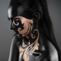 the makeup design gives her an almost tribal or mask-like appearance. Her expression is neutral and she is looking off to the side. The background is plain and does not distract from the subject.