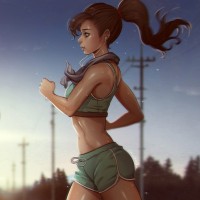 an animated character who appears to be a young girl or teenager, running outdoors. She has her hair tied in a ponytail and is wearing a sportswear top and shorts that suggest she might be engaged in