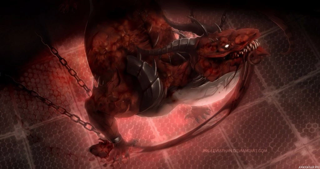 mythical creature often found in fantasy literature or media. The creature appears to be chained up, which could imply that it is imprisoned or contained. The surrounding area looks dark and grimy, with chains and what seems like