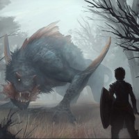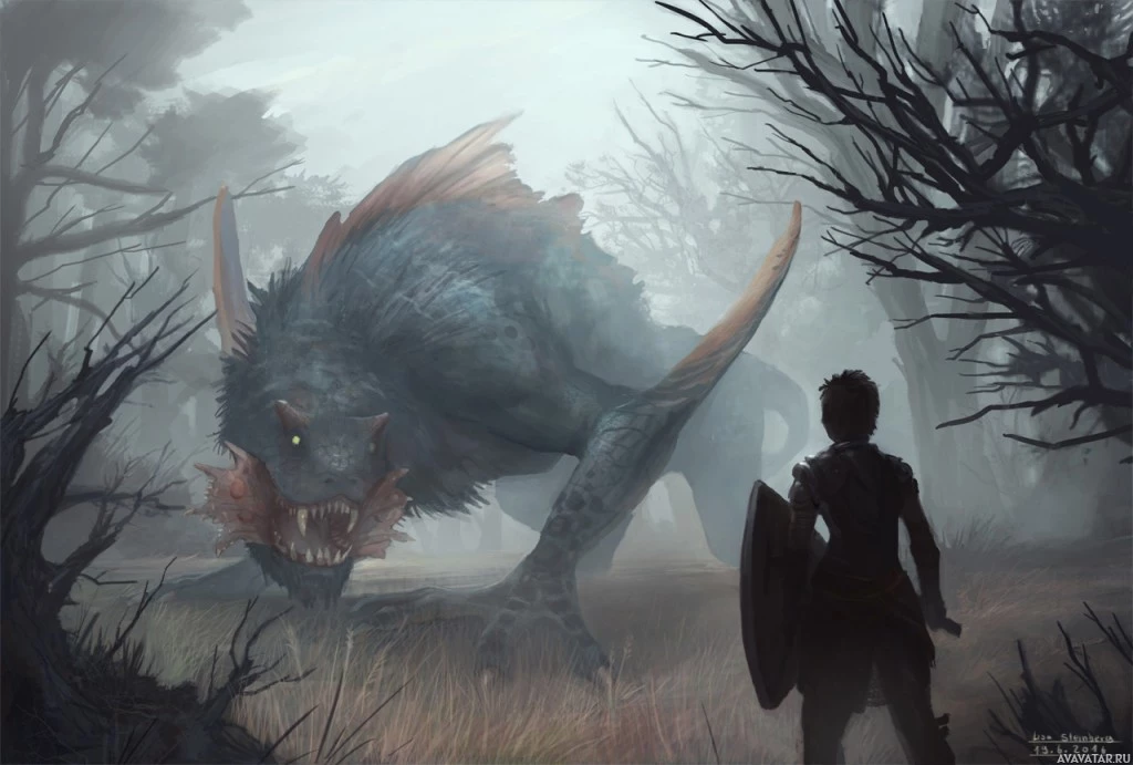 a fantasy warrior standing in front of a towering monster. The monster appears to be a creature with large spiky teeth,