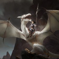 a fantasy scene with a girl riding on the back of a dragon. They are both positioned in front of