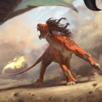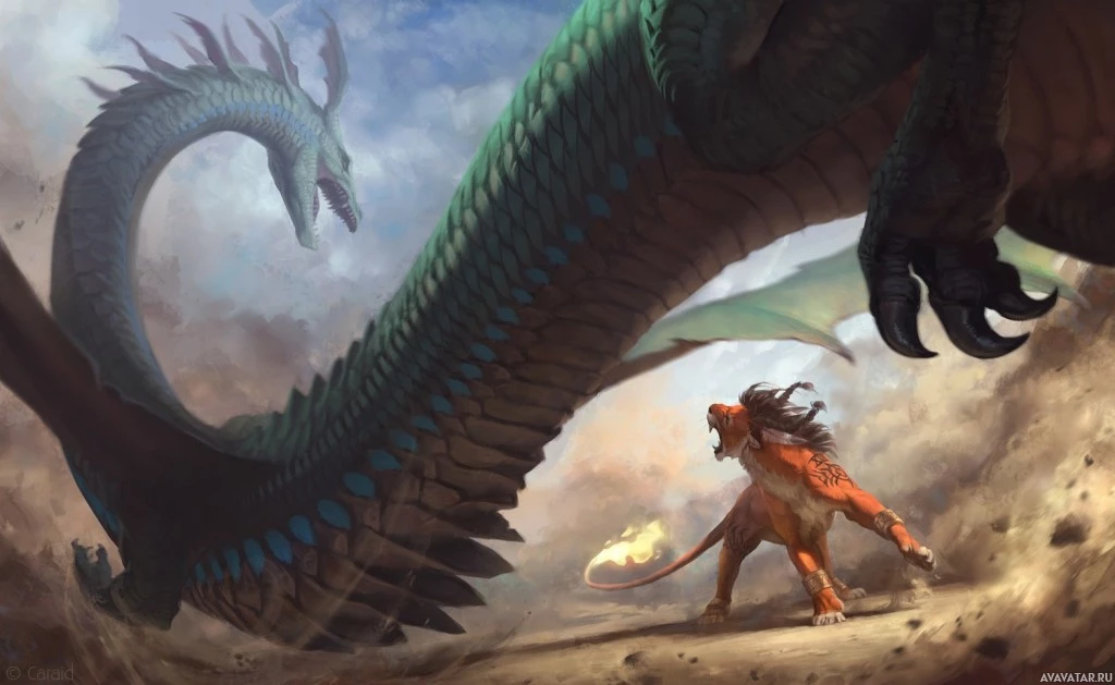 human figure dressed in what looks like armor and holding a sword, observing the battle between the two dragons. The setting seems to be an open