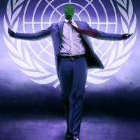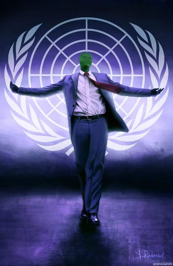 the United Nations emblem, which features a globe surrounded by olive branches with doves on them, a universal sign of peace. Below the UN logo, there is text that reads "Anonym". The overall composition and the juxtaposition of elements in the image might suggest themes related to global governance,