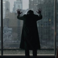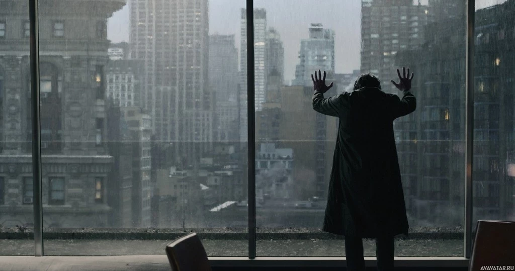 a trench coat or cloak, looking out of an office window. It seems to be