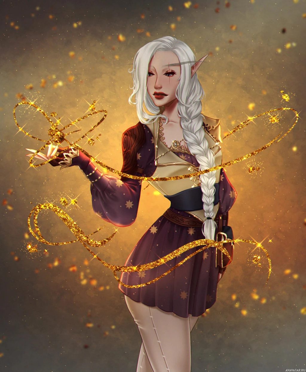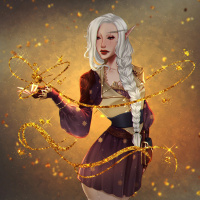 The image features a fantasy-themed character who appears to be an elf. She has