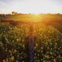 warm hues, suggesting it's either dawn or dusk. The landscape around the path appears to be grassy and well-maintained, possibly indicating that this is a designated bike trail or