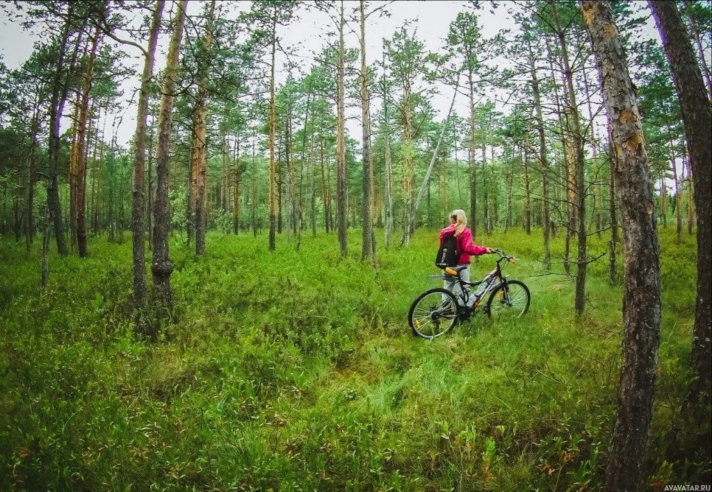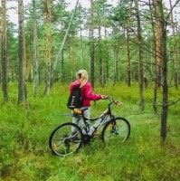 casual clothing suitable for cycling and the outdoors. The surroundings are lush with greenery, indicating that it might be spring or summer. It's