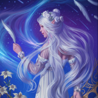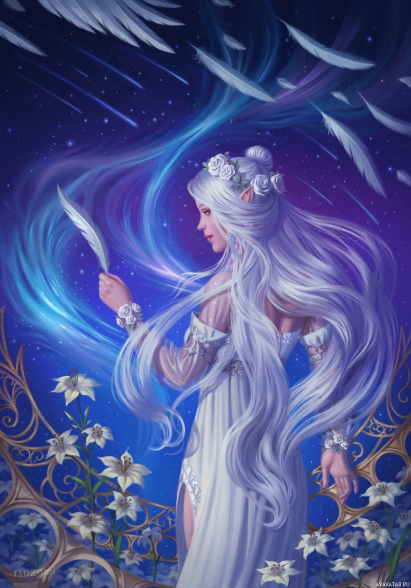 white hair cascading down her back. She appears to be holding a feather in her hand and is situated amidst a starry