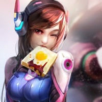 This image depicts an illustrated character, D.Va from the video game "Overwatch." She is dressed in her signature armor and has a serious expression on her face. In her hand, she's holding what appears to be a sandwich or snack item with a bite taken out of it, possibly suggesting she's taking a break during her duties as a character in the game. The artwork is vibrant and detailed, capturing the essence of D.Va's character design.
