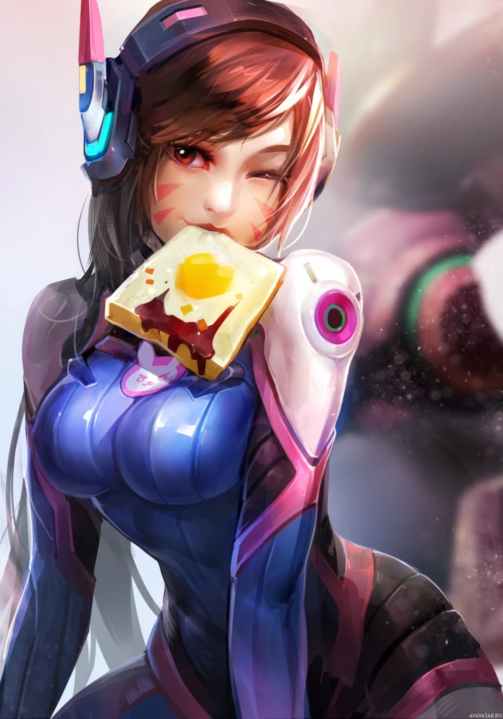 На этом изображении изображен иллюстрированный персонаж Д.Ва из видеоигры «Overwatch». Она одета в свою фирменную броню и имеет серьезное выражение лица. В руке она держит то, что кажется бутербродом или закуской, с укусом, взятым из нее, возможно, предполагая, что она делает перерыв во время своих обязанностей в качестве персонажа в игре. Художественная работа яркая и подробная, отражающая суть дизайна персонажа D.Va.