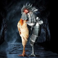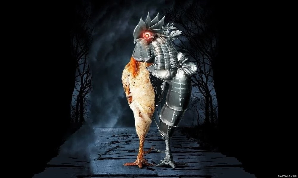 mechanical parts and a head that resembles a bird. The robot appears to be interacting or greeting another character who is dressed as a chicken. They are standing in front of a dark background that looks like