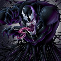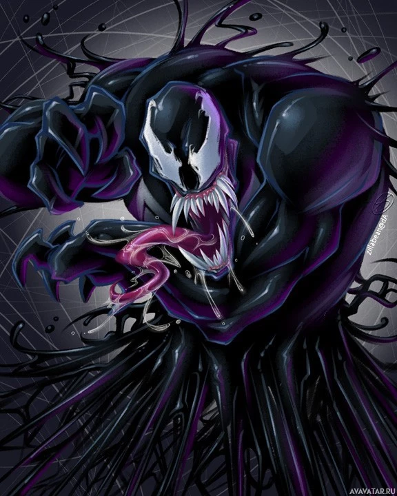 an illustrated character that appears to be the symbiotic anti-hero Venom. This character is known for its black and purple color scheme,