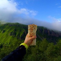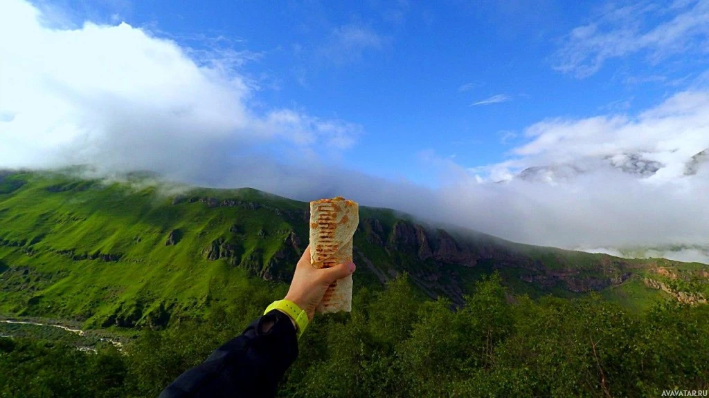 a food item that appears to be a sandwich or some sort of wrapped food, possibly containing meat and vegetables. The background shows a scenic view with mountains, green hills, trees, and