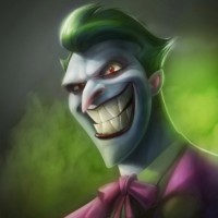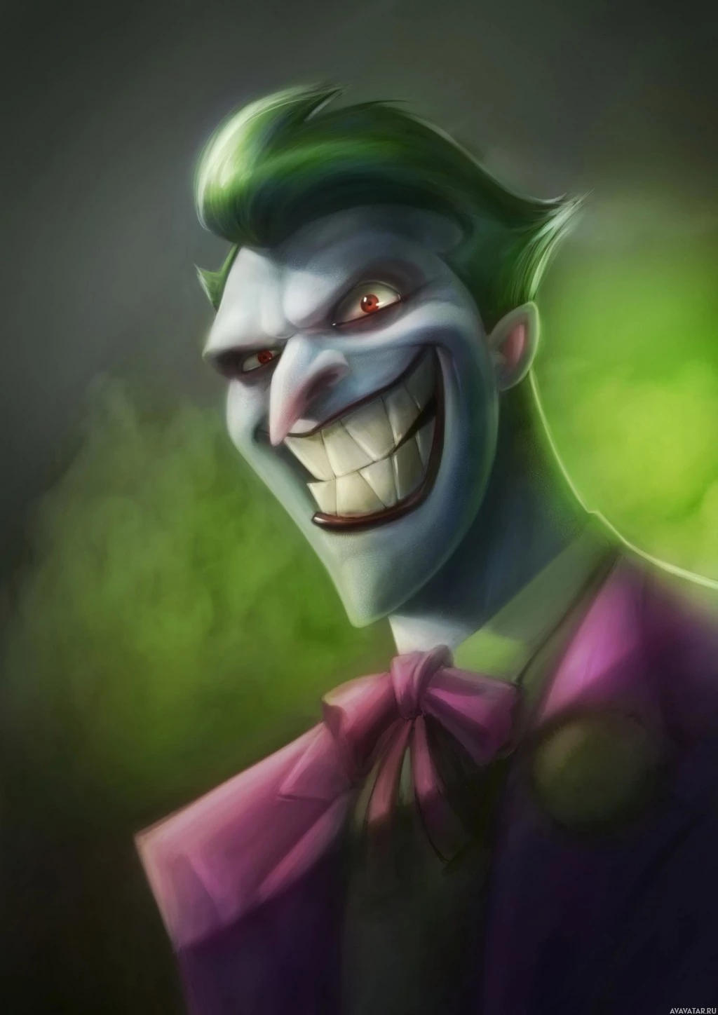 green hair, white skin, and red accents around his eyes and mouth, which are typical elements associated with this character's appearance. The Joker is known for his