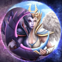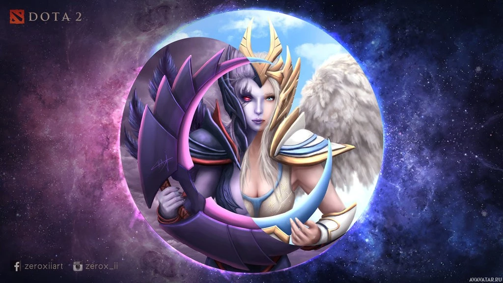 На картинке изображен персонаж Vengeful Spirit из видеоигры Dota 2. Она известна своей фиолетовой и розовой цветовой гаммой, и она персонаж магического типа. Ее оружием выбора является посох с черепом на нем, который представляет ее агрессивный стиль игры.