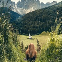 Картинка показывает безмятежный пейзаж с горами вдалеке и зеленью, окружающей передний план. Молодая женщина со светлыми волосами сидит на траве, глядя на живописный вид. Она, кажется, расслаблена и наслаждается моментом одиночества среди природы.