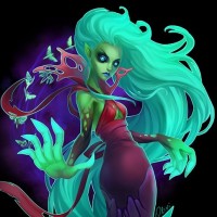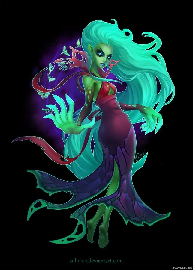 a fantasy character known as the Death Prophet from the game Dota 2. She has long, flowing green hair and is wearing