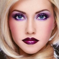 blonde hair styled in waves, wearing dark lipstick and purple makeup around her eyes. She has