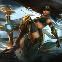 an action pose, wielding a staff or wand that emits magical energy and casting a spell on the ground below her. The artwork showcases detailed armor and accessories, suggesting she might be a warrior or mage within