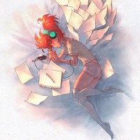 red hair, wearing headphones and lying down. She appears to be in her pajamas and seems relaxed or possibly sleeping while listening to music through the headphones. She is surrounded by a number of papers that seem to have fallen around her, which adds