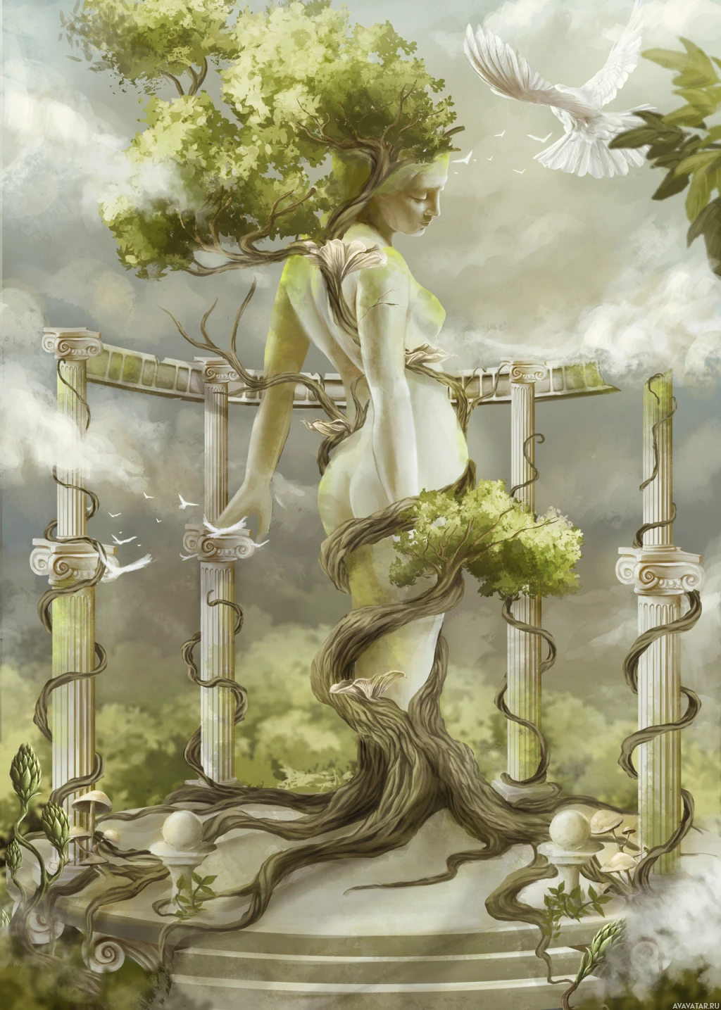 a figure of a person from behind, seemingly carved or sculpted into the trunk of an old tree. The person is depicted in profile with their hands resting on what appears to be a statue or pedestal. Above them, there are birds soaring and a dove flying towards them, suggesting a peaceful and serene atmosphere. The surrounding environment includes greenery and elements that give the impression of an ancient setting, possibly inspired by classical architecture and