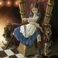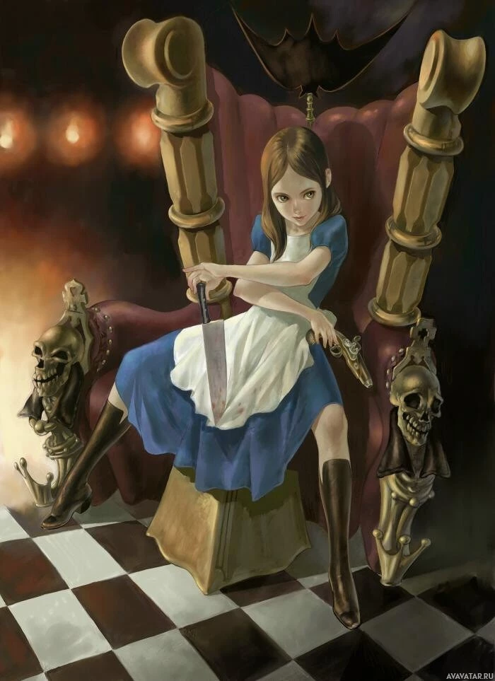 a female character, resembling Alice from the classic Lewis Carroll story "Alice in Wonderland." She is sitting on a throne-like chair and holding a knife. The character has