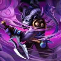 the video game "Dota 2." This is Riki, known for his role as an agility hero and for wielding swords. He is characterized by his feline features, such as ears and a tail, suggesting that he may be a cat-like creature. The background has purple hues with swirling patterns, which might indicate