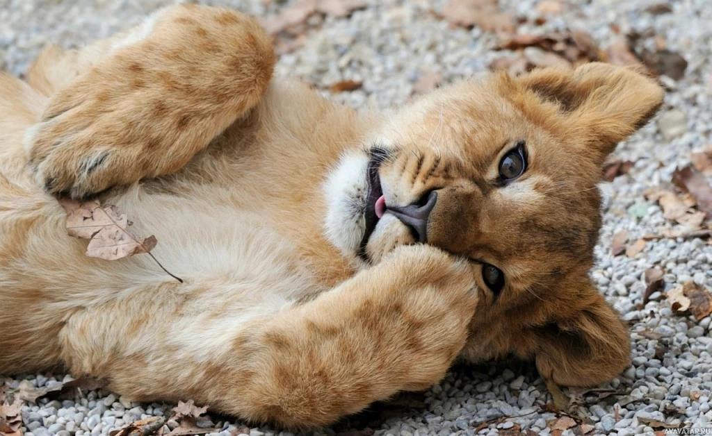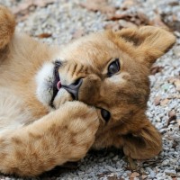 lion cub lying on its back with its paws in the air, appearing to be playful and relaxed. There is some dirt and debris around it, suggesting an outdoor setting that might resemble their