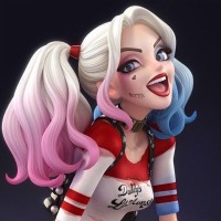 The image shows a character from the Batman series, Harley Quinn. She is known for her colorful outfit with red and black hair, and a face painted to resemble a jester or clown. The character is seated on what appears to be a gargoyle-like structure, possibly a part of Gotham City's architecture.