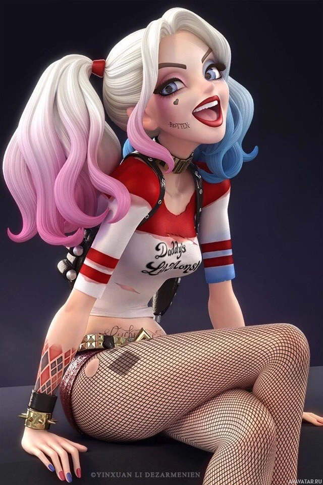 На картинке изображен персонаж из серии «Бэтмен», Харли Куинн. Она известна своим красочным нарядом с рыжими и черными волосами, и лицом, окрашенным, чтобы напоминать шута или клоуна. Персонаж сидит на том, что кажется похожей на горгулию структурой, возможно, частью архитектуры Готэм-Сити.