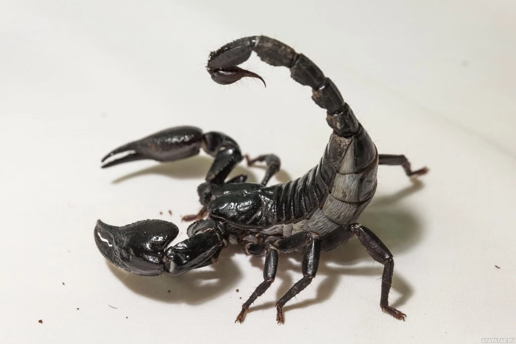 На картинке изображен скорпион. Похоже, что это крупный план, фокусирующийся на деталях его тела и хвостовых сегментов, которые характерны для этого типа животных.