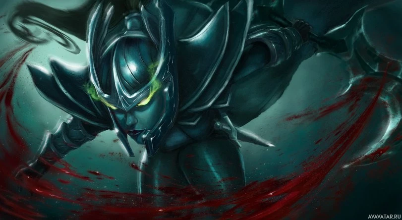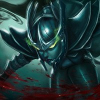 a fantasy creature with a humanoid form, dressed in dark armor with accents of green and blue, wielding what appears to be a magical or enchanted weapon. The background has a moody,