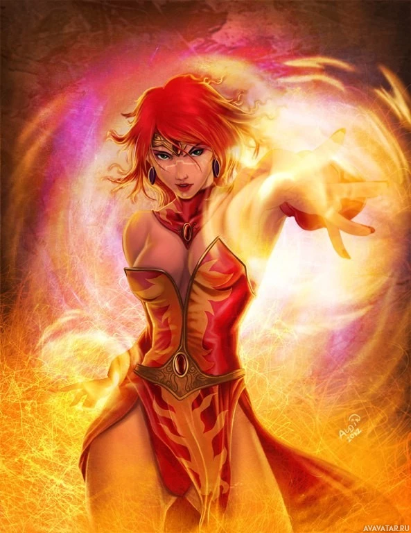 female character who appears to be Lina, a heroine from the game Dota 2. She is shown in action, wielding what looks like