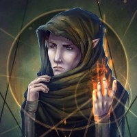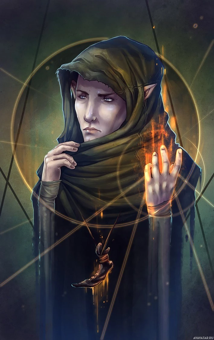 a fantasy character, likely an elf given the context. The character is depicted with hooded robes and appears to be engaged in some sort of magical or mystical activity, as indicated by