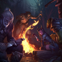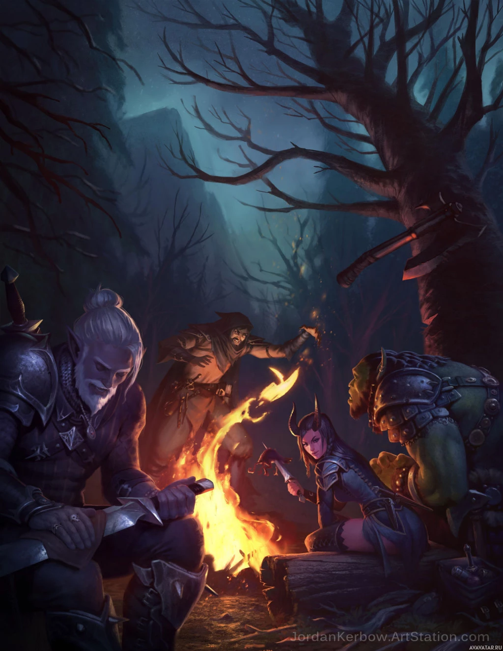 a fantasy scene featuring characters gathered around a bonfire. There are two individuals seated on the ground with their back to the viewer; one is wearing armor and seems to be holding an object, while the other is in