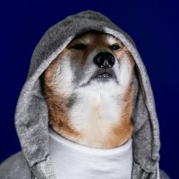 a hooded sweatshirt. The dog appears to be standing on all fours and is looking directly at the camera. The background is plain and blue, which may suggest that this photo was taken indoors or in