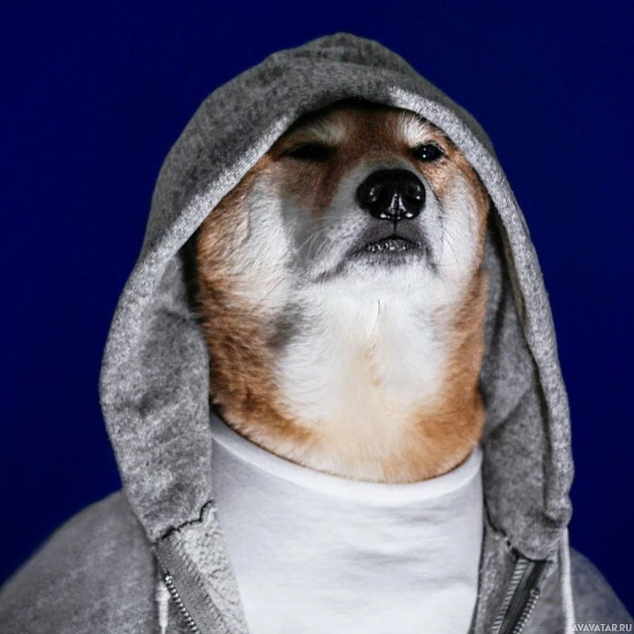 The image shows a dog wearing a hoodie with the hood up, resembling a human wearing
